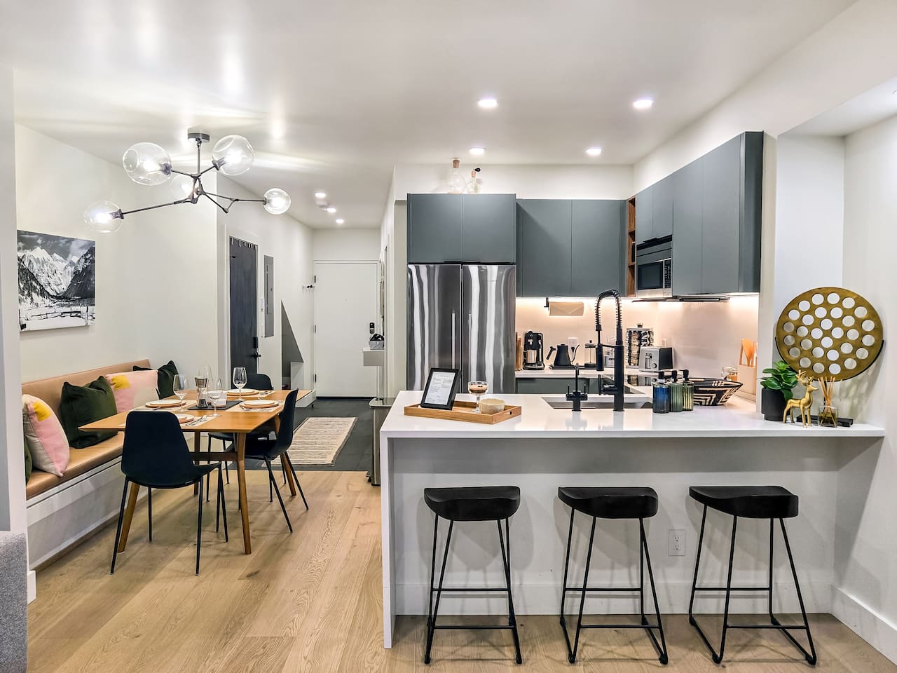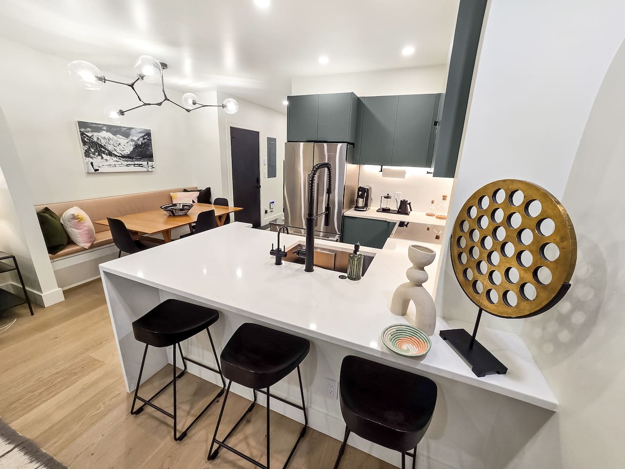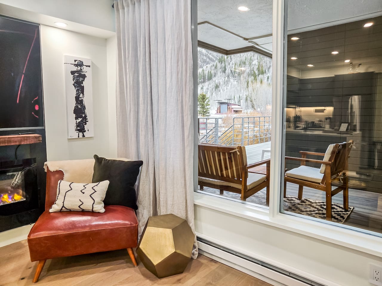 Upon entering your condo you will discover a welcoming, modern, open floor plan that seamlessly combines all living spaces. The living area offers an inviting atmosphere to unwind and create everlasting memories - gather around the electric fireplace and prepare for a tranquil and entertaining evening, streaming your favorite shows and movies on the smart TV. The kitchen has been appointed with a modern Caraway chefs inventory that will make cooking a breeze. There is nothing like returning home from a soothing time in the community hot tub to a delicious homemade meal. Enjoy easy access to an extensive deck with seating and impressive views of the nearby mountains. Additional perks include an in room washer/dryer and on-site washer/dryer room.